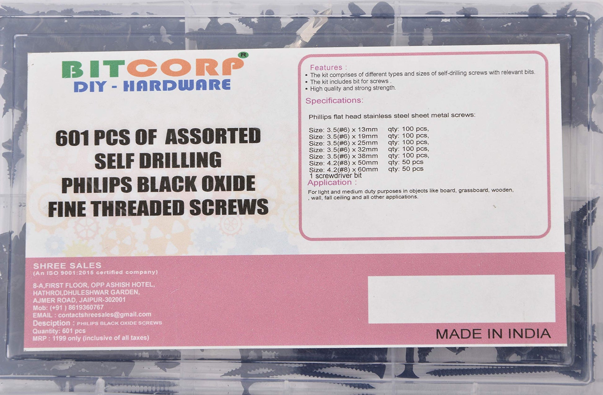 BITCORP DIY Hardware 601ASDS Metal Assorted Self Drilling Philips Black Oxide Fine Threaded Screws (Pack of 601)